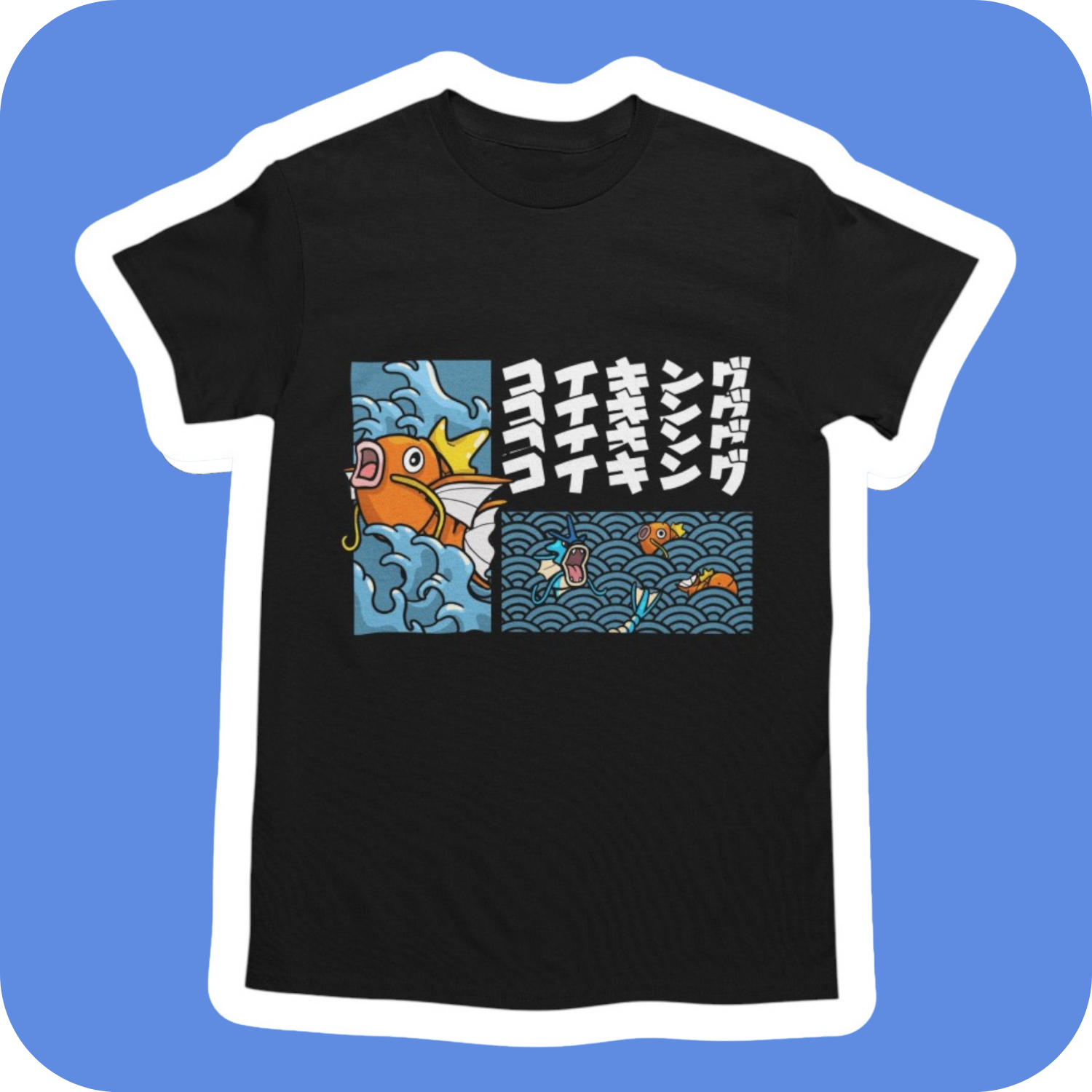 A shirt featuring Magicarp and Gyarados. There is also a chance for a shiny Gyarados!! The shirt is made of 100% ring spun cotton G64000 blends softness and durability. This modern classic tee is great for lounging or going to a movie.
